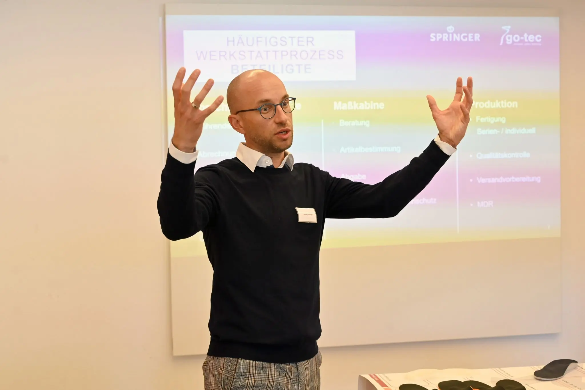 Unter dem Titel "Handwerk digital" - Additive Fertigung in der Orthesenwerkstat, stellte Orthopädietechniker-Meister Axel Ruppert seine Gedanken und Ideen vor, wie additive Verfahren Mitarbeiter entlasten können. Die besten Mitarbeiter würden am Patienten und in der Werkstatt gebraucht. Angesichts des Fachkräftemangels bestehe jedoch die Gefahr, dass gerade diese Mitarbeiter durch zu viele Aufgaben überlastet werden. Am Beispiel der Orthesenfertigung stellte er vor, wie durch additive Fertigung (3D-Druck) Mitarbeiter in der Produktion entlastet werden und sie dadurch ihre Kompetenz am Patienten einsetzen können. Zudem könnten über die neue Technologie attraktive, zukunftsorientierte Arbeitsplätze geschaffen werden. Die Entlastung der Mitarbeiter durch mehr Effizienz im Versorgungs- und Produktionsprozess zog sich wie ein roter Faden durch die Workshops. Boris Hermsen, Key-Account-Manager bei Springer, zeigte gemeinsam mit Henning Schnittger, Geschäftsführer des Technikpartner go-tec, welches Potential zur Optimierung im Einlagenprozess steckt. Dies betrifft aus Ihrer Sicht die Beratung in der Einlagenversorgung, aber auch die Abläufe im Betrieb. Vor allem, wenn ein Unternehmen mehrere Standorte betreibe, müsse man sicherstellen, dass alle Abteilungen jederzeit Zugriff auf alle auftragsrelevanten Daten haben, von der Annahme des Auftrags über die Fertigung bis zur Abgabe des Produktes. Das bedeute, dass alle Prozesse auch digital abgebildet werden müssen. Auch in der Beratung zur Einlagenversorgung könnten die Mitarbeiter durch digitale Hilfsmittel unterstützt werden, um „Mehr-Wert“ bei den Einlagen zu verkaufen.